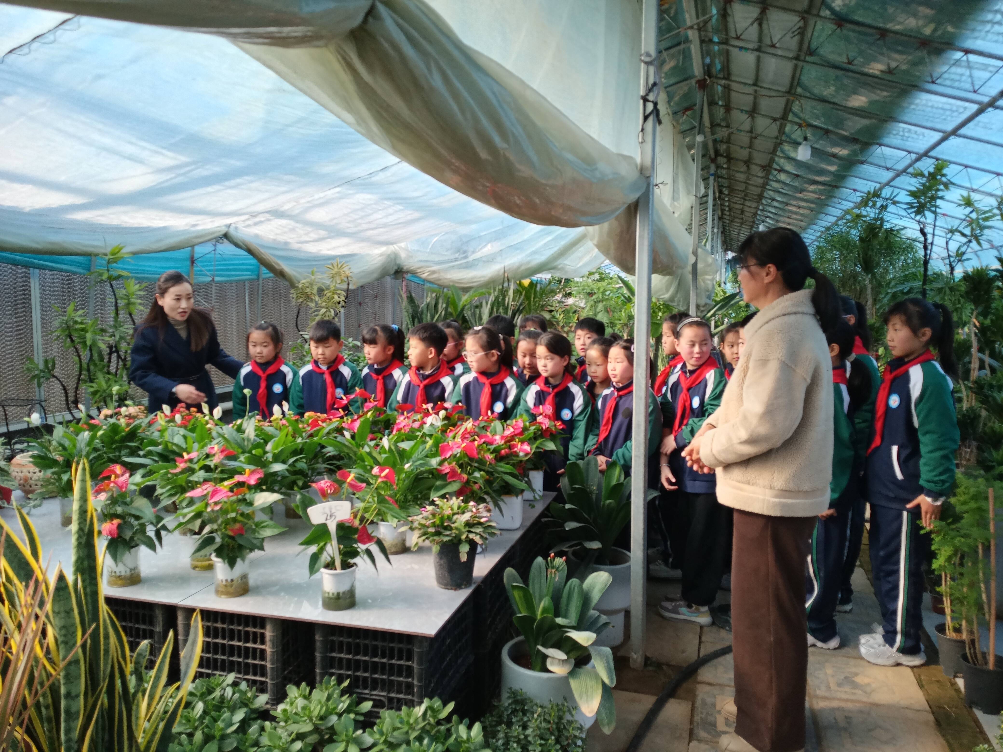 在花棚内,祝蕊老师引导学生观察花卉形态色彩,结合小雪气候讲解花卉适应生存的方式,如多肉厚实多汁的叶片用于储存水分抵御寒冷。学生们围聚花丛,观察花瓣纹理、感受草木清香,领悟“闭塞而成冬”的物候哲理。这一过程让学生亲近自然,培养观察力与思考力,懂得尊重自然、顺应自然,树立人与自然和谐共生的理念。