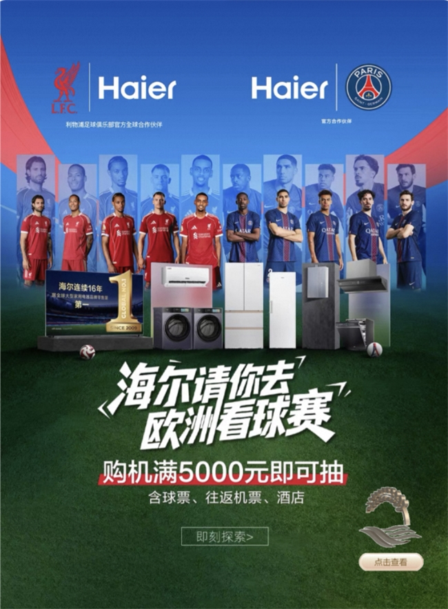稳定发挥好服务、好权益优势,让用户下单不纠结。以往用户等待时间长的送装环节,海尔智家通过深化数字化变革,即下单即安排发货,全国10万服务兵,覆盖336个城市、2840个区县,保证乡镇村也能送装无忧。今年9月,海尔智家官宣成为利物浦和巴黎圣日耳曼足球俱乐部全球官方合作伙伴,此次双十一亦成为一场惊喜狂欢派对。10月15日—11月14日,凡在天猫“海尔官方旗舰店”购机满5000元,就有机会抽取欧洲足球观赛之旅大奖,还有抢球星周边、免单惊喜、万元红包等福利,精准击中体育迷。