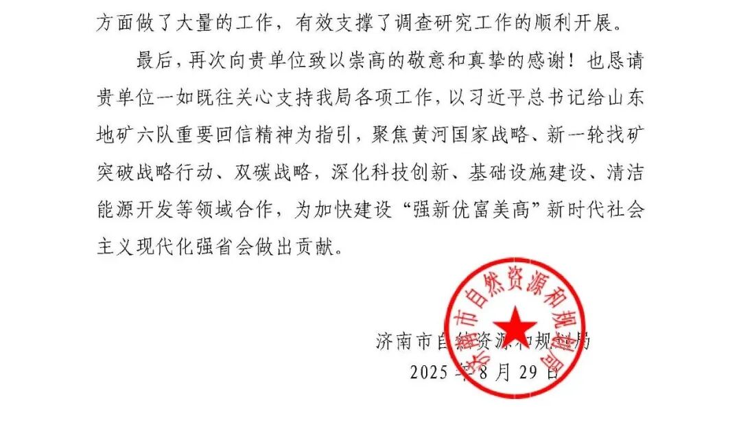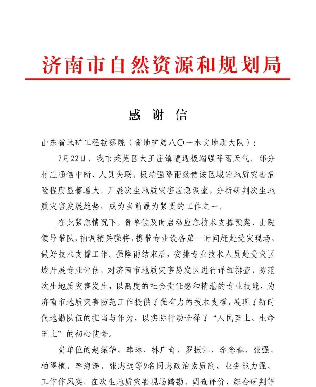 近日,济南市自然资源和规划局向山东省地矿工程勘察院发来感谢信。信中对我院赵振华、韩琳、林广奇、罗振江、李念春、张强、柏得植、李海涛、张志远等9位同志在7月22日莱芜区大王庄镇遭遇极端强降雨的情况下,赶赴受灾现场,高效、科学、有序地为地质灾害应急防控提供全方位技术支撑,在工作中的积极作为与高效配合给予高度评价。