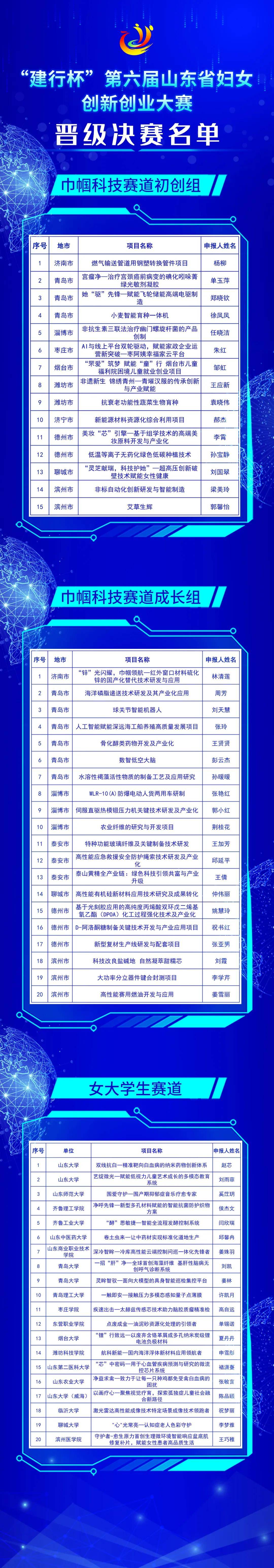 名单于大赛官网同步公布(“建行杯”第六届山东省妇女创新创业大赛官网地址:https://sdsfncxcyds.newchuangye.com) |