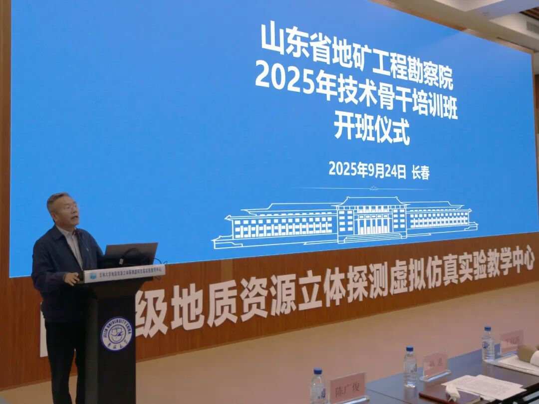 吉林大学原党委副书记、副校长,吉林省地质学会、吉林省创新人才研究会理事长韩晓峰出席开班仪式,他期望以此次培训班为契机,推动省勘院与吉林大学地学部构建长期、稳定的紧密合作关系,希望双方围绕国家及行业的重大战略需求,在科研协同攻关、人才教学培养、实践资源共享以及课题项目联合申报等关键领域,开展全方位、深层次的务实合作,