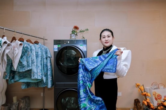 然而,这些面料往往难以打理。"非遗刺绣、华服面料极其娇贵,水洗容易缩水变形,干洗又会损伤面料质感,长期以来都是非遗传承中的难题。”现场一位非遗主理人道出困境。卡萨帝洗衣机正为此而来。她搭载的养护湿洗科技,能通过AI精控科技智能匹配进水量与湿洗剂配比,用AI直驱算法以莫比乌斯轨迹轻柔翻转,配合专研湿洗剂产生的绵密泡沫在纤维表面形成保护膜,在实现深层清洁的同时降低物理磨损。洗护后面料光泽如初,纹路清晰立体。