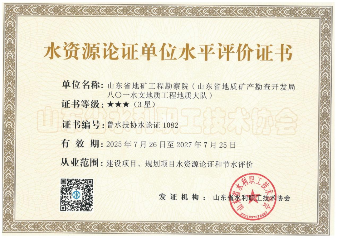 近日,山东省地矿工程勘察院(山东省地质矿产勘查开发局八〇一水文地质工程地质大队)顺利通过主管部门审核,成功取得水资源论证水平评价三星,标志着我院在水资源论证和节水评价领域的技术实力和服务能力实现新突破。