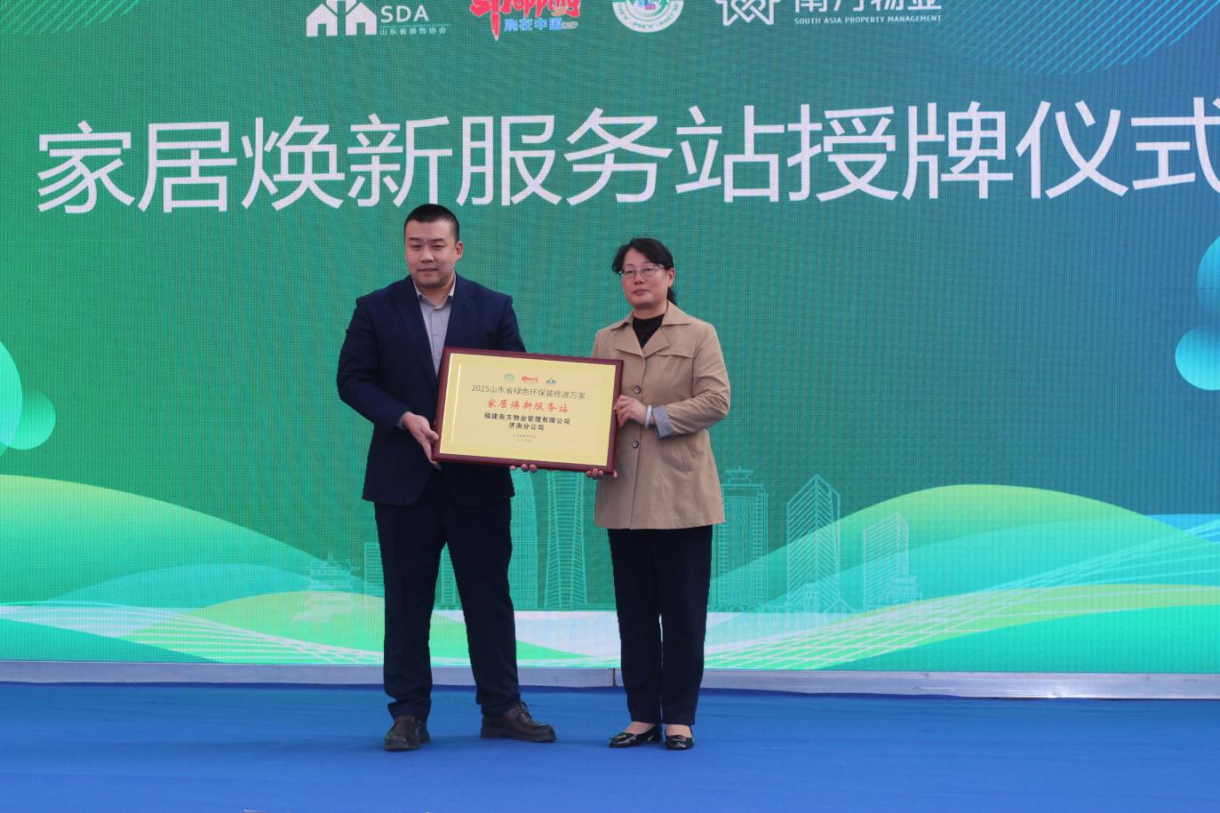 山东省装饰协会党支部宣传委员陈冬梅为南方物业颁发“家居焕新服务站”铜牌,标志着名士豪庭社区家居服务体系进一步完善。该服务站将作为长期对接平台,持续为居民提供装修咨询、政策解读、售后协调等服务,推动促消费活动从“一次性落地”向“常态化服务”延伸。
