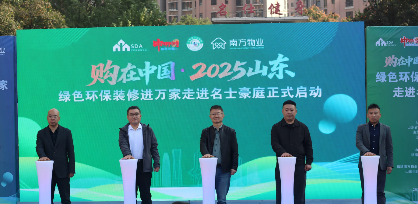出席领导共同登台启动“购在中国・2025年山东绿色环保装修进万家走进名士豪庭”,启动柱点亮瞬间,象征着政企协三方合力推动绿色消费、服务民生的决心,也标志着此次社区促消费活动正式进入启动。