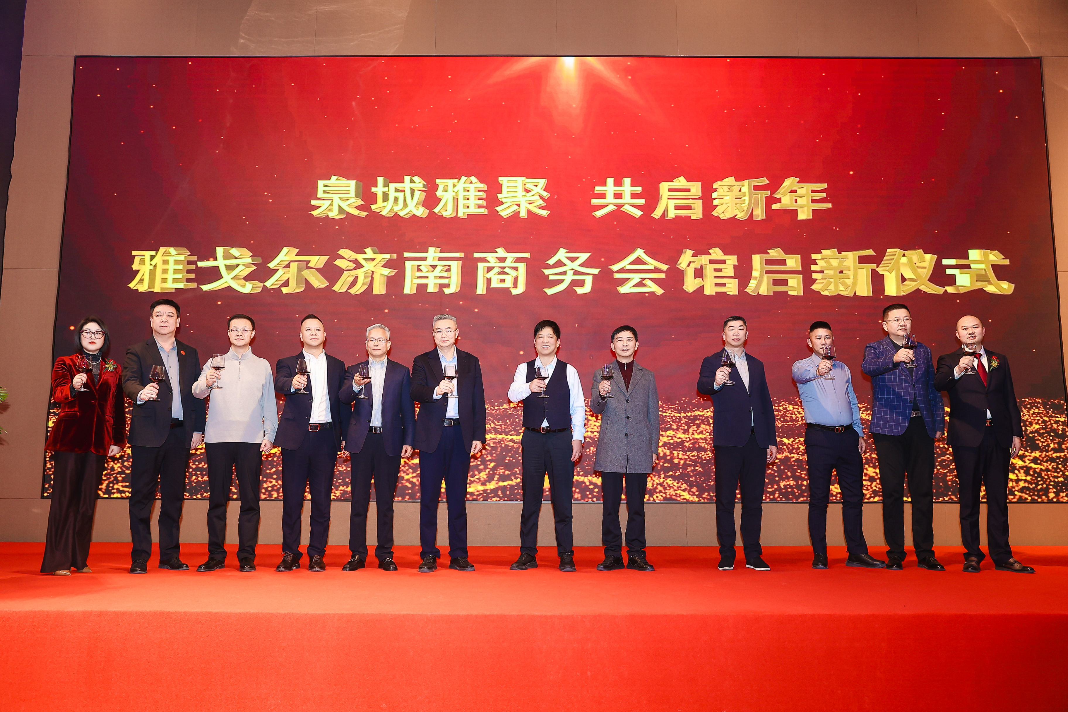 仪式环节:雅戈尔集团董事长李如成,浙江省工商联原副书记蔡晓春,人民日报社山东分社原社长徐锦庚,建行山东分行副行长包建军,银座集团股份有限公司总经理罗逸贤,上海悦来港集团董事长杜利峰,宁波经促会山东会长江旭东,济南婚姻协会会长孟一兵等12位嘉宾共同开启“泉城雅聚,共启新年”雅戈尔济南商务会馆启新仪式。徐锦庚、江旭东现场致辞。